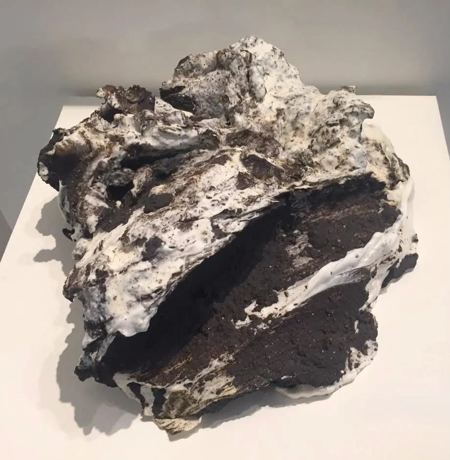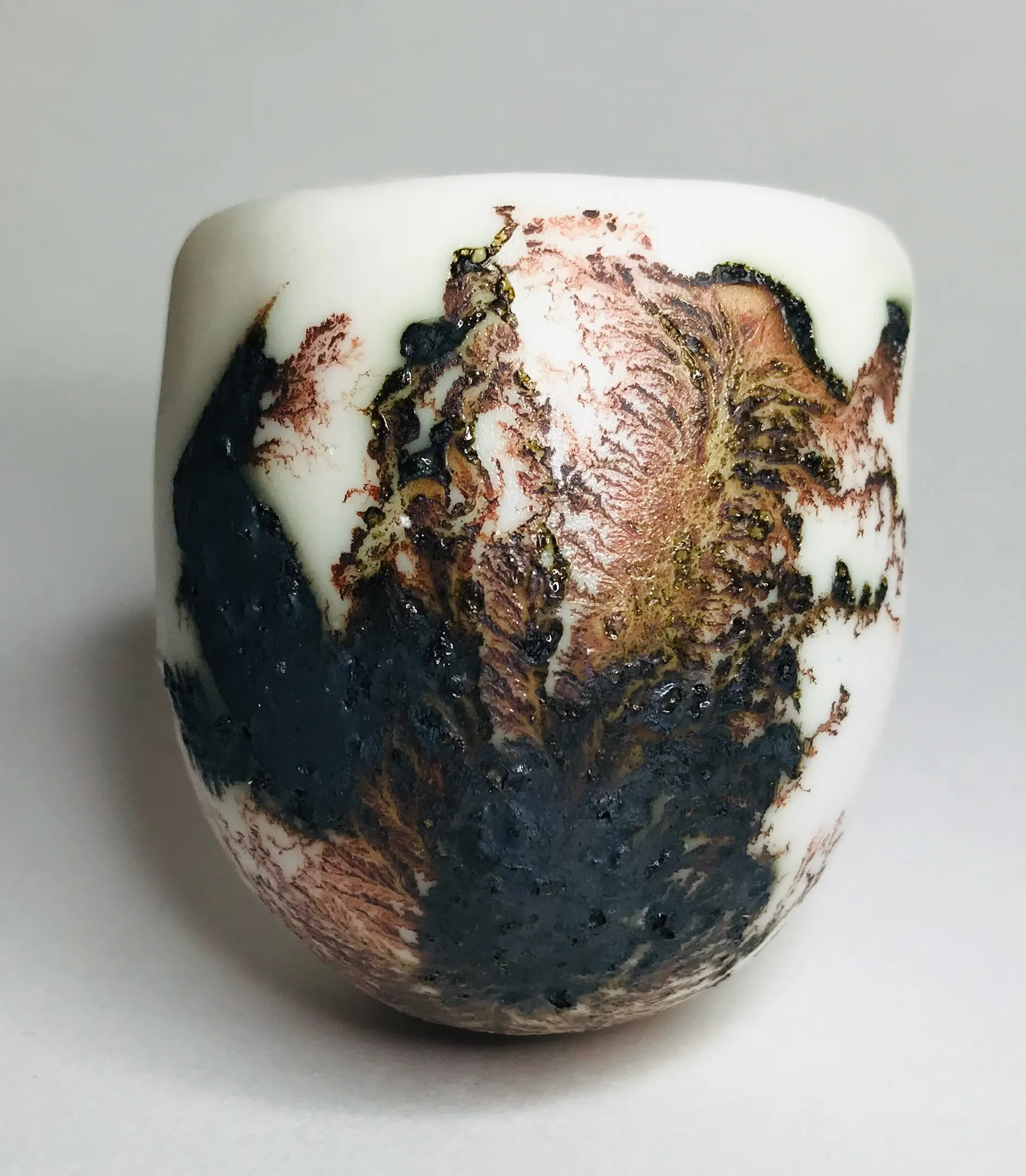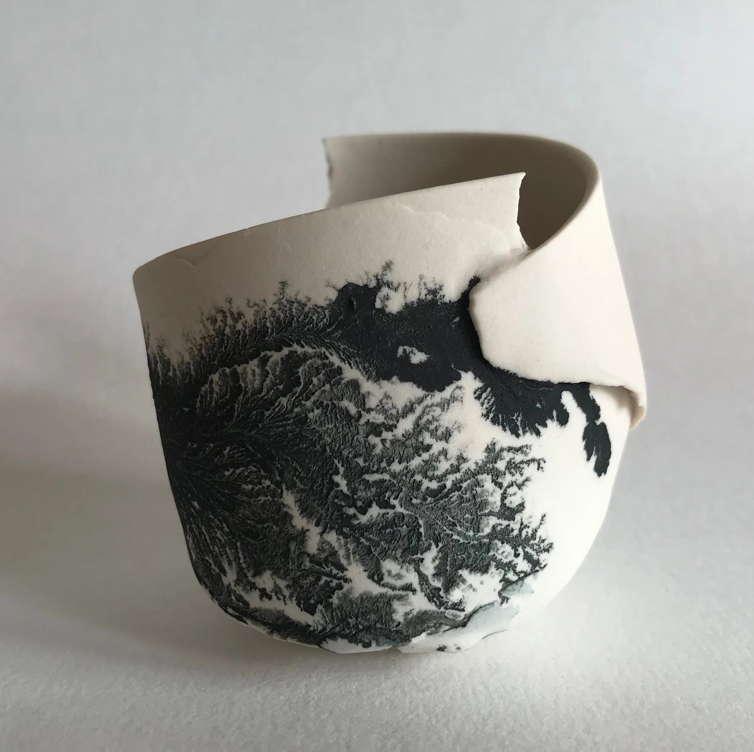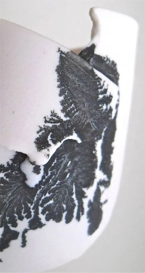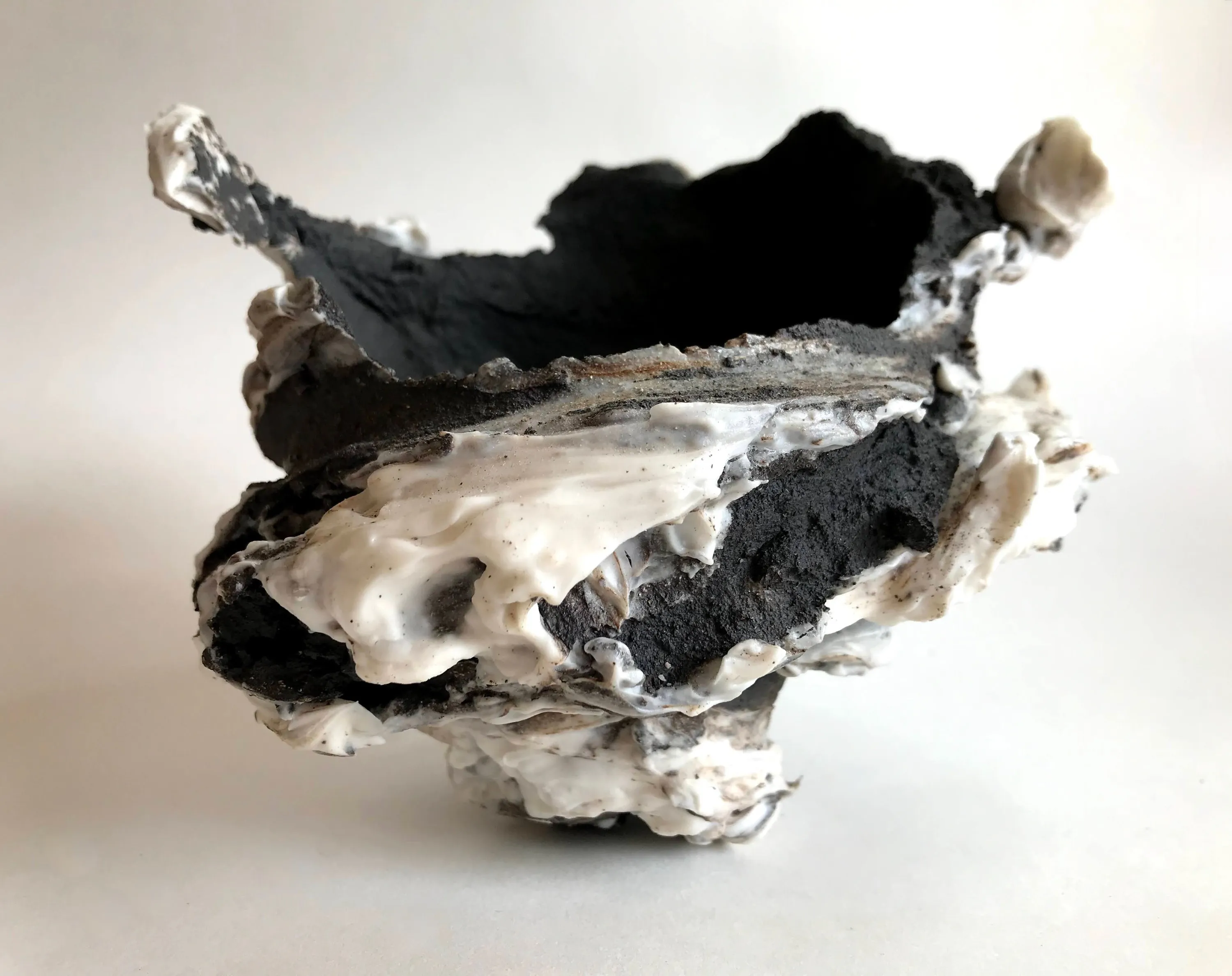 Her ceramic work is innovative and dynamic, pushing the boundaries of the material. She uses clay in a semi-liquid state to produce expressive, fluid forms. The scale of her work ranges from large abstract sculptural pieces to intimate porcelain vessels with exquisite, diffused surfaces.
