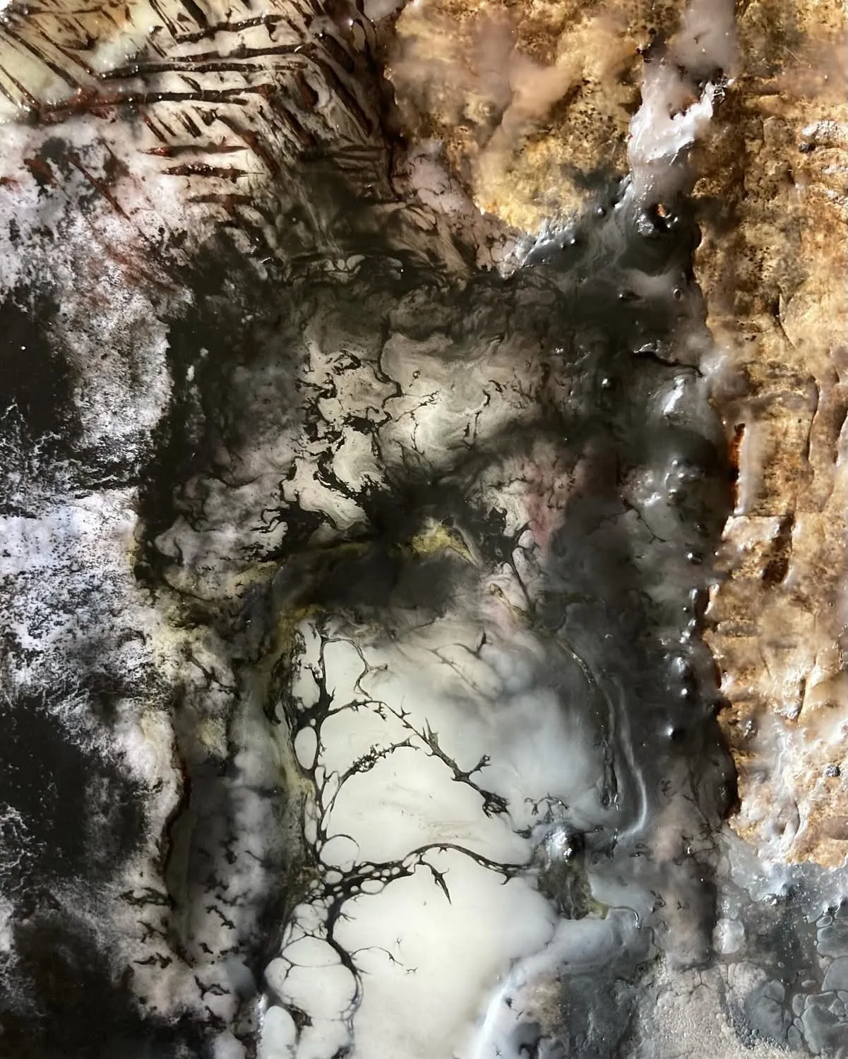 I’m embracing a slower approach in my recent encaustic work, enjoying the interaction and ongoing conversation as the material transforms its state from solid to liquid - at times organic and fluid - before cooling, encasing and preserving, holding the fluidity as a memory in its newly solid form.
